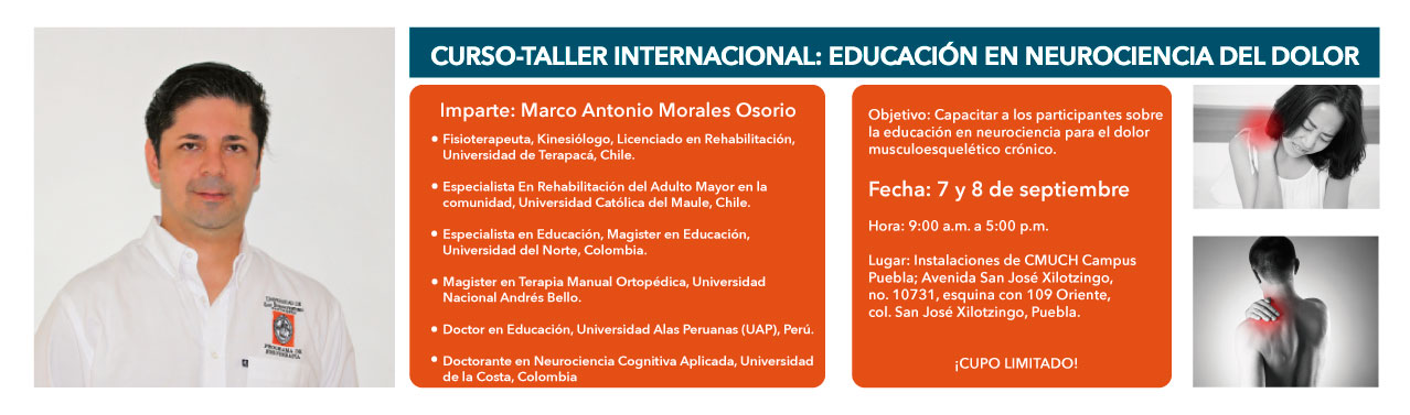 Con el Curso – Taller Internacional: Educación en Neurociencia del Dolor, aprenderás a tratar el dolor musculoesquelético crónico. Duración de dos días en un horario de 9:00 a.m. a 5:00 p.m. Solicita informes al correo vinculacionsocial@cmuch.edu.mx