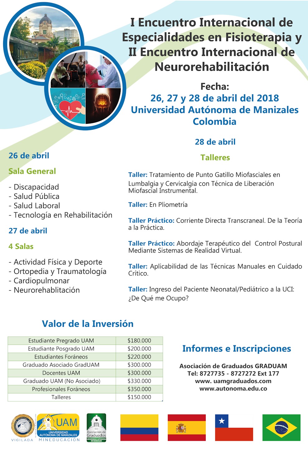 La Universidad Autónoma de Manizales (UAM) convoca al I Encuentro Internacional de Especialidades en Fisioterapia y II Encuentro Internacional de Neurorehabilitación a celebrarse los días 26, 27 y 28 de Abril del 2018. Informes e inscripciones: Asociación de Graduados GRADUAM a los teléfonos 8727735 y 8727272 Ext. 177, o en las páginas: uamgraduados.com y autonoma.edu.co