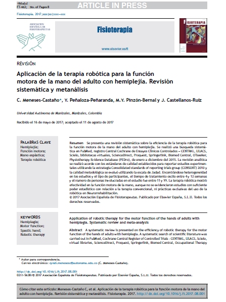 Se presenta una revisión sistemática sobre la eficiencia de la terapia robótica para la función motora de la mano del adulto con hemiplejía. Se realizó una búsqueda sistemática en PubMed, registro Central Cochrane de Ensayos Clínicos Controlados – CENTRAL, LILACS, Scielo, bibliotecas virtuales, ScienceDirect, Proquest, Springerlink, Biomed Central, OTseeker, Physiotherapy Evidence Database (PEDro), de enero a diciembre del 2015. La revisión analítica se realizó acorde con los estándares de calidad establecidos para reportar estudios experimentales utilizando la estrategia Consolidated standards of reporting trials group (CONSORT) 2010 y la calidad metodológica se evaluó utilizando la escala de Jadad. Encontrándose heterogeneidad en los estudios y el tipo de participantes, el tiempo de tratamiento oscilo entre 4 y 12 semanas y el número de personas involucradas en el estudio fue entre 11 y 99. La terapia robótica mostró efectividad en la función motora de la mano, aunque no se evidenciaron estudios con suficiente poder estadístico con relación a la terapia convencional, ni prácticas exclusivas del uso de la robótica en Neurorrehabilitación.