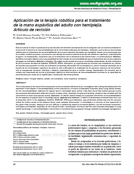 Este artículo de revisión es producto de la construcción del referente conceptual de una investigación que se está desarrollando en el marco de la Maestría en Neurorehabilitación de la Universidad Autónoma de Manizales, Colombia, acerca del uso de la terapia robótica para el tratamiento de neurorehabilitación de la mano espástica del adulto con hemiplejía, donde se ha encontrado que los eventos cerebrovasculares son procesos que afectan de manera especial la función de miembros superiores, especialmente el agarre y la manipulación, situaciones que se correlacionan con el compromiso del control motor y el control postural.